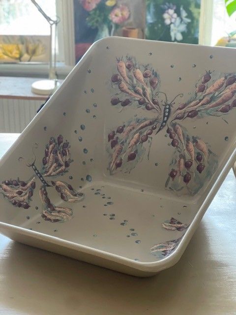 The butterfly helps pollinate our crops and makes the harvest possible. The sugar pea in the motif is an indicator crop; each pea in the pod bears witness to a visit – a pollination – a collaboration. That is why the peas are scattered, as a sign of diversity, life, and the presence of pollinators.